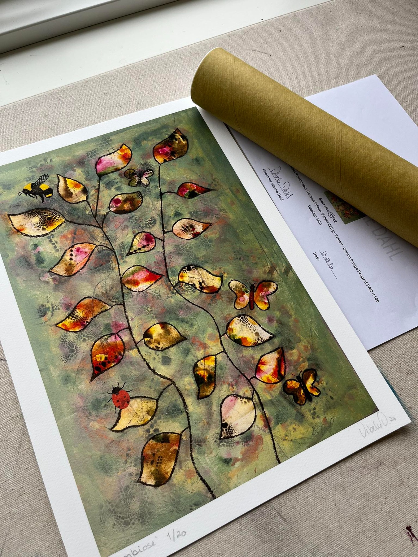 For å sikre høyest mulig kvalitet samarbeider jeg også med en profesjonell fotograf som dokumenterer originalmaleriene før trykk. Dette er avgjørende for at farger, kontraster og detaljer gjengis så nøyaktig som mulig i det ferdige trykket. Resultatet er et giclée-trykk som ligger tett på originalen, både visuelt og i uttrykk.